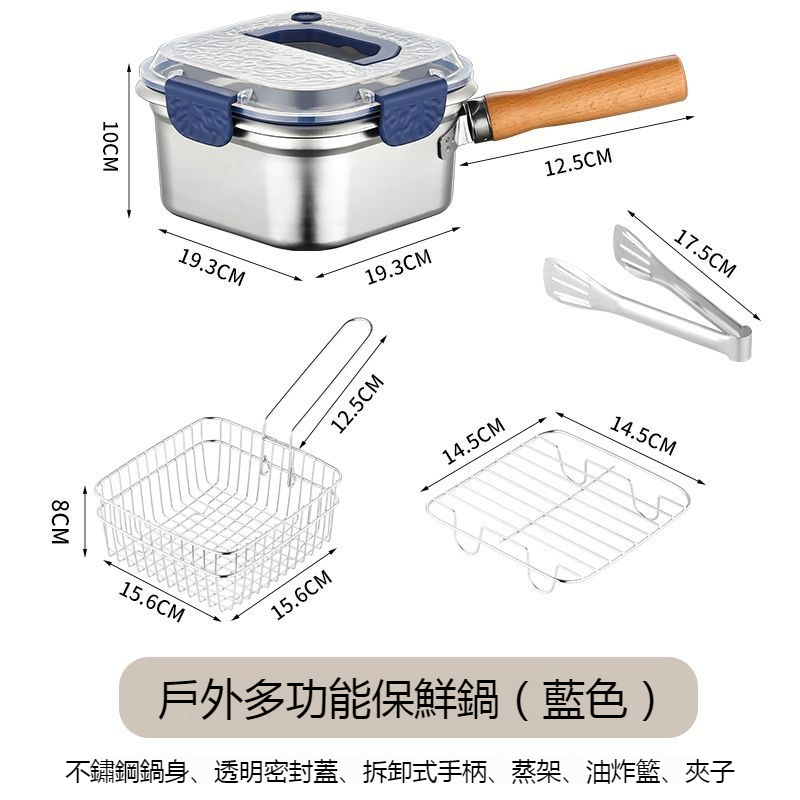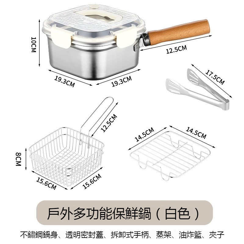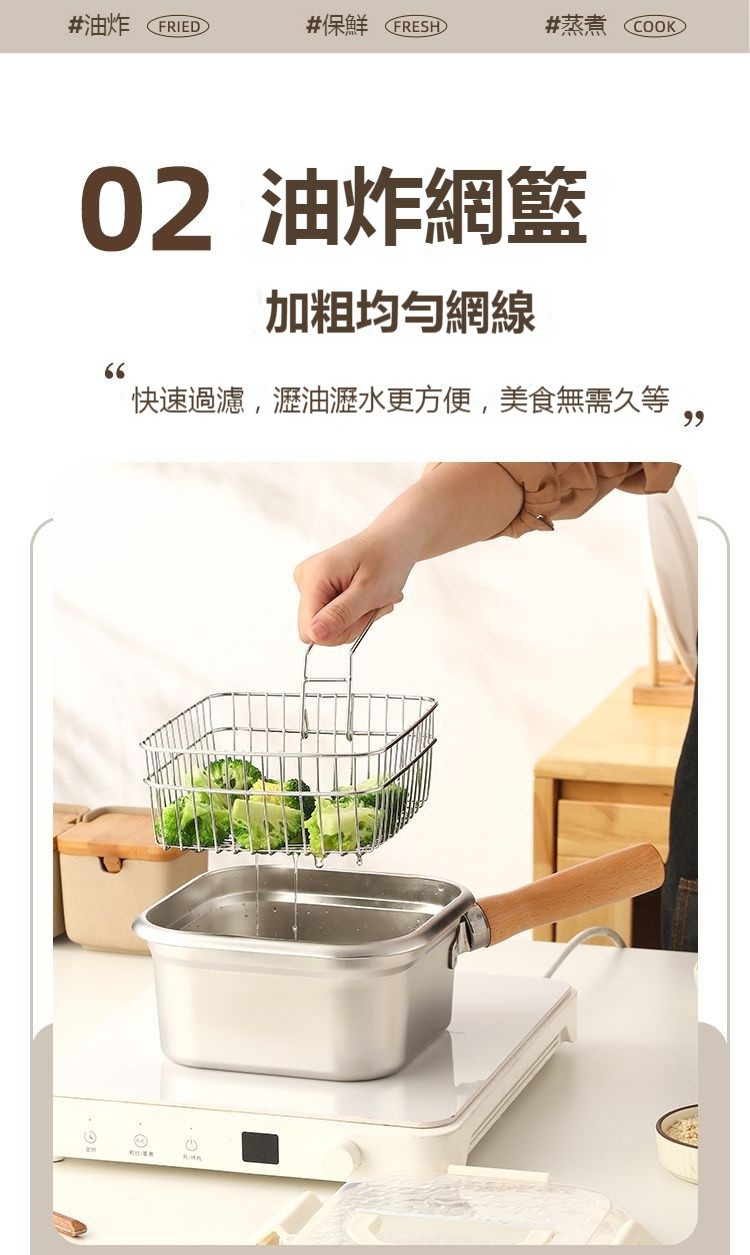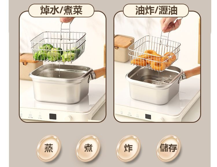 多功能不鏽鋼炸鍋套裝【不鏽鋼鍋身、透明密封蓋、拆卸式手柄、蒸架、油炸籃、夾子】,不挑爐灶,可進烤箱,可拆卸收納,一鍋搞定油炸、保鮮盒、蒸鍋、湯鍋、瀝水、洗水果、煮水餃、煮雞蛋、泡麵鍋等